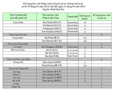 Đầu năm 2014, 33 học viên từ 11 khu vực bị “xét xử” vì các tội danh bị cáo buộc sai khác nhau. 33 tội danh không gì khác ngoài vẫn kiên định vào tín ngưỡng đã chọn của họ, và do đã dũng cảm nói cho công chúng về cuộc bức hại Pháp Luân Công. 16 người trong số họ bị kết án tù như bảng biểu dưới đây.