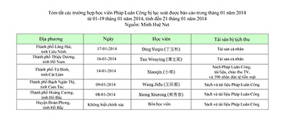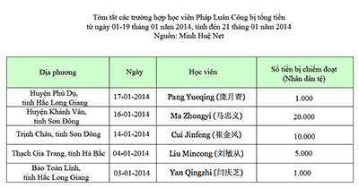 Trong 19 ngày đầu tiên của năm 2014, 228 học viên ở 22 địa phương bị bắt và bị lục soát: 41 trường hợp ở tỉnh Liêu Ninh, 39 ở Sơn Đông, 24 ở Hắc Long Giang, 24 ở Trùng Khánh, 15 ở Tứ Xuyên, 14 ở Hồ Nam, 11 ở Bắc Kinh, 8 ở Hồ Bắc, 7 ở Giang Tô, 6 ở Hà Bắc, 6 ở Nội Mông Cổ, 5 ở Giang Tây, 4 ở Hà Nam, 4 ở Cát Lâm, 4 ở Thiểm Tây, 3 ở Quảng Đông, 3 ở Chiết Giang, 3 ở Cam Túc, 2 ở Quý Châu, 2 ở Thượng Hải, 2 ở Ninh Hạ và 1 ở Thiên Tân.