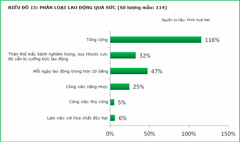 Trong số 3.653 trường hợp tử vong trong bản báo cáo điều tra này, tổng cộng có 6% học viên Pháp Luân Công tức là 221 trường hợp mà trong lần bức hại cuối cùng đến chết đã phải chịu lao động quá sức. Trong số 221 học viên Pháp Luân Công bị bức hại bằng lao động quá sức này, tổng cộng có 49 người vì thế mà tử vong, tỷ lệ tử vong của cưỡng bức lao động quá sức là 22%.