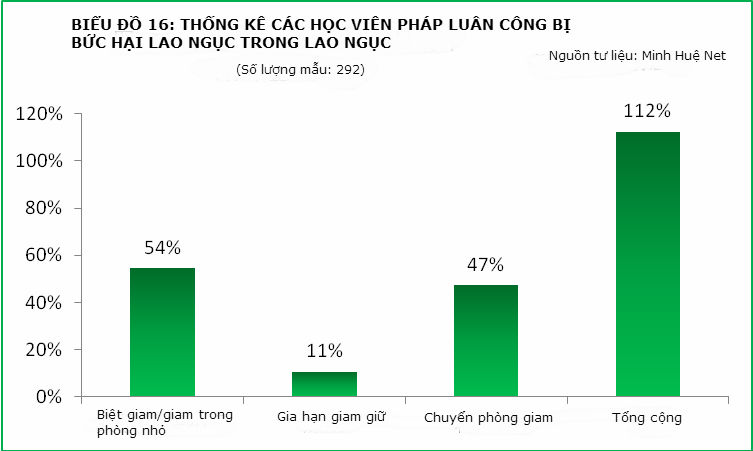 Trong số 3.653 trường hợp tử vong trong bản báo cáo điều tra, tổng cộng có 8% học viên Pháp Luân Công 292 trường hợp vào lần bức hại cuối cùng đến chết là bị bức hại “lao ngục trong lao ngục”, cụ thể kết quả thống kê như sau (Biểu đồ 16):