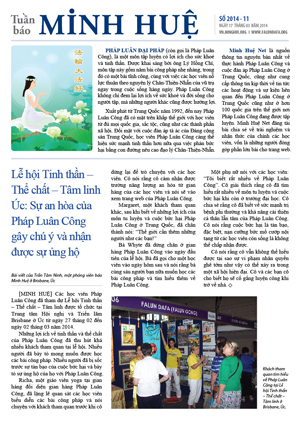 [MINH HUỆ 20-03-2014]Tuần báo Minh Huệ tổng hợp tin tức hàng tuần về cuộc đàn áp ở Trung Quốc và các sự kiện của học viên Pháp Luân Công trên khắp thế giới, với dạng thức là bản in màu định dạng PDF, gồm 4 trang. Bản PDF này định dạng khổ A4 tiện dụng cho việc in ấn phổ thông.