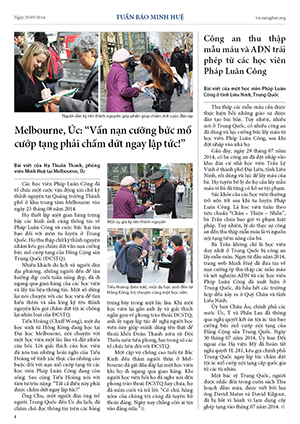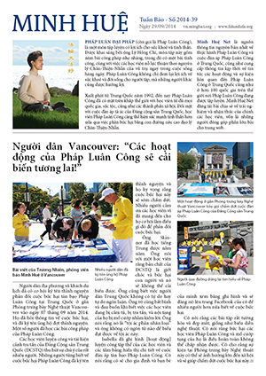 [MINH HUỆ 29-09-2014]Tuần báo Minh Huệ tổng hợp tin tức hàng tuần về cuộc đàn áp ở Trung Quốc và các sự kiện của học viên Pháp Luân Công trên khắp thế giới, với dạng thức là bản in màu định dạng PDF, gồm 4 trang. Bản PDF này định dạng khổ A4 tiện dụng cho việc in ấn phổ thông.