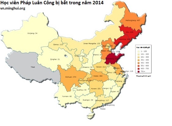 [MINH HUỆ 07-01-2015] Theo sau việc chính quyền Cộng sản Trung Quốc đóng cửa các trại lao động dưới áp lực của quốc tế vào cuối năm 2013, con số các học viên Pháp Luân Công bị bắt trong năm 2014 tăng lên 29,8%, theo số liệu của Minh Huệ Net tính đến ngày 05 tháng 01 năm 2015. Trong năm 2014, ở cấp tỉnh, 23 trong tổng số 30 tỉnh thành và khu tự trị tại Trung Quốc đều cho thấy sự gia tăng của các vụ bắt giữ.