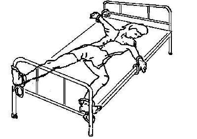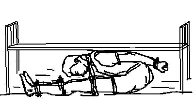 Phương pháp này thường được dùng cho các đệ từ trong các bệnh viện tâm thần, trại giam, và trại cải tạo vì họ không chịu ly khai với Pháp Luân Công. Phần thân thể dưới của các đệ tử trói vào cái giường, với hai tay bị còng qua một bên giường, phiá trên hoặc dưới giường, như thế để họ không thể trốn được. Một số đệ tử bị còng như vậy trong mấy tuần, một vài trường hợp lên đến 4 tháng.