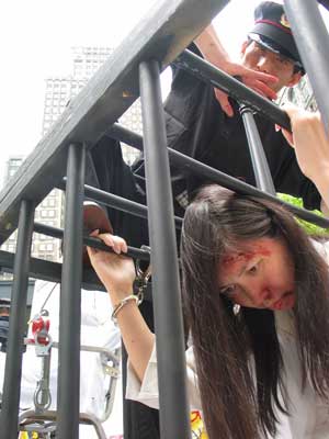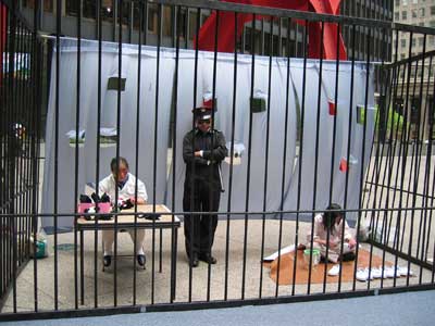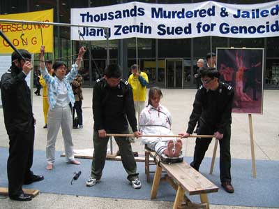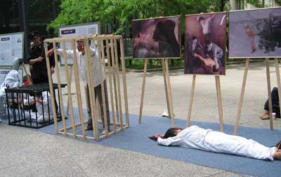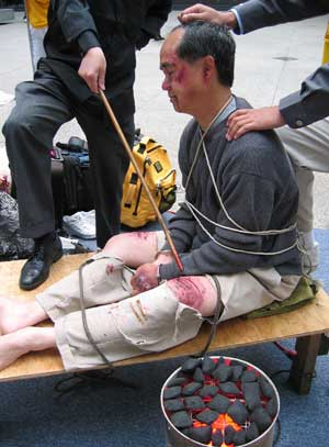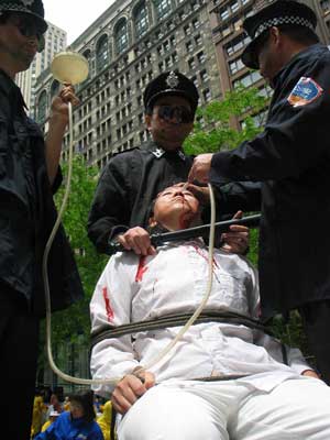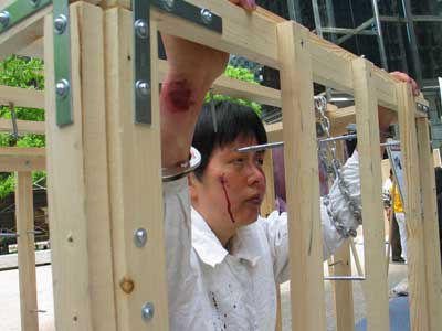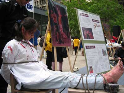 [Chính Kiến] Ngày 24 tháng 5 năm 2004, những người tập Pháp Luân Công đã tổ chức triển lãm ảnh và dựng lại cảnh tra tấn với tiêu đề “Đàn áp vấp phải những nguyên tắc đạo đức” tại Federal Plaza ở trung tâm thương mại Chicago để cho mọi người thấy những cách tra tấn tàn bạo đối với những người tập Pháp Luân Công ở Trung quốc.