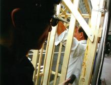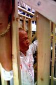 Một cụ già đóng vai tù nhân bị trói chặt và treo lên trong xà lim như thế trong hơn 1 tiếng đồng hồ. Con trai của cụ ta bị tra tấn, giam cầm hơn 2 năm tại Trung quốc chỉ vì tu luyện Pháp Luân Công. Con trai cụ còn bị nhiều đòn tra tấn dã man hơn thế nữa.
