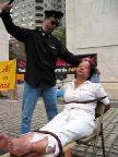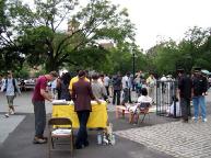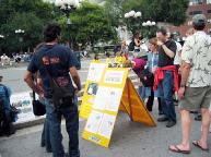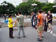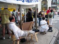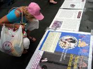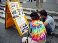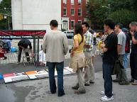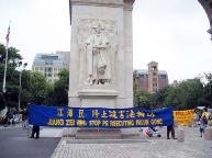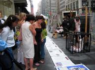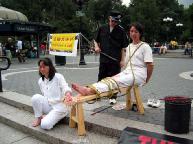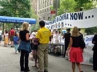 [Minh Huệ] Vào ngày 14 và 15 tháng 8, các đệ tử Pháp Luân Công tổ chức một cuộc triển lãm tại một địa điểm ngã tư khá đông người qua lại tại Broadway ngay trung tâm thành phố Nữu Ước. Cuộc triển lãm này thu hút nhiều sự chú ý của hàng ngàn người khách bộ hành. Rất đông người dừng lại để xem những hoạt cảnh tra tấn và lên án chính sách khủng bố dã man của chế độ Giang Trạch Dân.