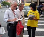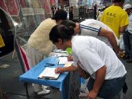 Một số người chảy nước mắt trong khi đọc vào những tấm hình tra tấn các đệ tử tại Trung quốc. Người này đến người khác, ai ai cũng muốn ký vào bản thỉnh nguyện lên án Giang và đám hầu đoàn trong chính sách khủng bố Pháp Luân Công và kêu gọi hãy chấm dứt ngay lập tức chính sách dã man này.