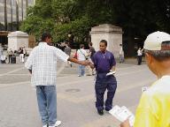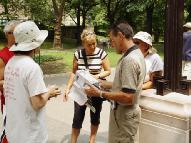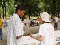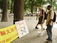 Một đệ tử khác và tôi rời nhóm trong giây lát và đi đến một chỗ khác rất xa với địa điểm hiện tại. Chúng tôi phân phát tài liệu ỏ đó, nhưng hiệu quả không cao như ở địa điểm củ. Người ở đó hình như không để ý gì chúng tôi và rất tách rời chúng tôi. Vì thế chúng tôi đi trở vế lại. Trong khi một số chúng tôi đang tập Công Pháp, một số phân phát tài liệu, và kết quả rất là tốt. Chúng tôi tìm tất cả các cơ hội để tiếp xúc với họ. Khi họ lắng nghe chúng tôi, họ cũng một phần biết được Pháp Luân Công là gì khi thấy các đệ tử khác đang tập Công Pháp, hay nhìn vào những tấm tài liệu mà chúng tôi đang trưng bày. Khi chúng tôi nói với họ về chính sách khủng bố, họ liền nhận tài liệu và đọc kỹ. Cách này có kết quả nhất.