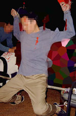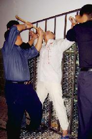 Trại giam Haidian Detention đè người đệ tử vào trong góc tường, đặt một cái ghế lên trên hai chân, và mấy tên công an đứng trên ghế đó và nắm giữ đầu anh đệ tử, sau đó có một tên công an dùng ba tông để đánh vào lòng bàn chân của anh ta.