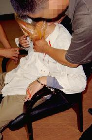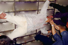 Tên giám đốc của trại giam ép tên tù nhân khoá người đệ tử vào khung giường, và dùng gậy để nạy răng người đệ tử. Năm hay sáu tên nắm giữ chặt người đệ tử trong khi đó họ dùng nước muối đậm đặc đổ vào một cái ống để nước muối chảy vào bao tử. Có một người đệ tử bị gãy hết răng, bị thương cả hàm anh ta.