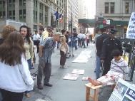 [Minh Huệ] Trong dịp Hội nghị Liên Hiệp Quốc lần thứ 59 tại Nữu ước, các đệ tử từ khắp nơi trên thế giới tập trung tại Nữu ước để giảng rõ sự thật sự thật về Pháp Luân Công và chính sách khủng bố Pháp Luân Công tại Trung quốc. Trước trụ sở Liên Hiệp Quốc và trên các con đường tại Manhattan, các đệ tử tổ chức những cuộc triển lãm, ký giấy thỉnh nguyện để kêu gọi chấm dứt chính sách khủng bố Pháp Luân Công tại Trung quốc và đưa Giang Trạch Dân ra trước công lý.