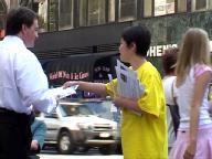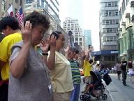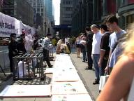 [Minh Huệ] Nhân ngày kỷ niệm 3 năm biến cố 11-9, toàn dân Hoa kỳ, đặc biệt là tại Nữu ước tổ chức nhiều lễ tưởng niệm cho biến cố này, lên án bọn khủng bố đã giết hại nhiều người vô tội. Thị trưởng Nữu ước Bloomberg nói chuyện trên tivi, kêu gọi toàn thế giới chống khủng bố, mà không để cho biến cố 9/11 tái diễn. Trên đường phố Nữu ước, các đệ tử Pháp Luân Công từ nhiều quốc gia tề tựu về đây, trải rộng trên khắp các nẻo đường, ngã tư, góc phố để giảng rõ sự thật và triển lãm chống khủng bố, kêu gọi thế giới giúp đỡ chấm dứt chính sách khủng bố do chính quyền Trung quốc phát động. Các đệ tử tổ chức triển lãm, hoạt cảnh chống tra tấn để cho mọi người chứng kiến được chính sách khủng bố vô nhân của chế độ Giang, mà đã giết hại hơn 1000 đệ tử Pháp Luân Công vì chính sách khủng bố, tra tấn dã man của chế độ.