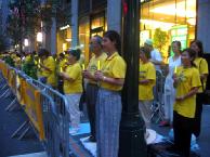 Mới đây, thời tiết tại Nữu ước thay đổi nhiều. Hôm nay là ngày nóng nhất, sau khi tạo thành 15 dãy phố của “Vạn lý Trường thành của lòng Can đảm” dọc theo Park Avenue vào buổi chiều và phát Chính niệm trước toà lãnh sự Trung quốc, có gần 500 đệ tử tham gia đêm tưởng niệm tối nay. Dọc theo đại lộ Park khang trang và sạch sẽ, những ánh đèn lập loè, lấp lánh. Mấy trăm đệ tử mặc áo vàng, lặng yên, kiên nhẫn đứng dọc theo con đường. Nhiều đệ tử đã cùng hát “Pháp Luân Đại Pháp Hảo” tiếng hát bay cao, nghe rất cảm động. Những giòng chữ trên những khẩu hiệu “Ngăn chận chính sách khủng bố Pháp Luân Công của chế độ Giang”, “Chính sách khủng bố tại Trung quốc làm hại người Hoa kỳ”. Có nhiều người qua lại, dừng lại xem, hỏi tin tức. Các tài xế tắc xi dừng xe lại để xin tài liệu, hay đưa cả đầu ra để đọc tài liệu, hình ảnh đang trưng bày.