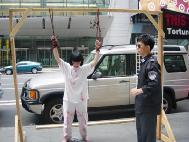 Khoảng 1 giờ chiều, khi tôi giải thích sự thật về Pháp Luân Công cho một thanh niên, anh ta nói “Các bạn không nên hoạt cảnh tra tấn trên đường phố. Nó không tốt cho trẻ em”. Anh ta chỉ đến một số các đệ tử thiếu nhi và nói “Bạn thấy không, những em đó còn quá nhỏ”. Trong khoảnh khắc đó, tôi không biết phải trả lời làm sao.