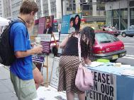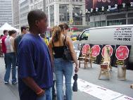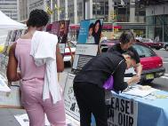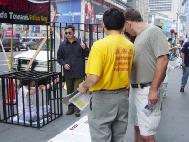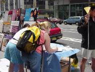 Triển lãm Chống Tra tấn tại Nữu ước: Một khách bộ hành biết được sự thật của chính sách khủng bố Pháp Luân Công, tự nguyện giúp đỡ phân phát tài liệu giảng rõ sự thật